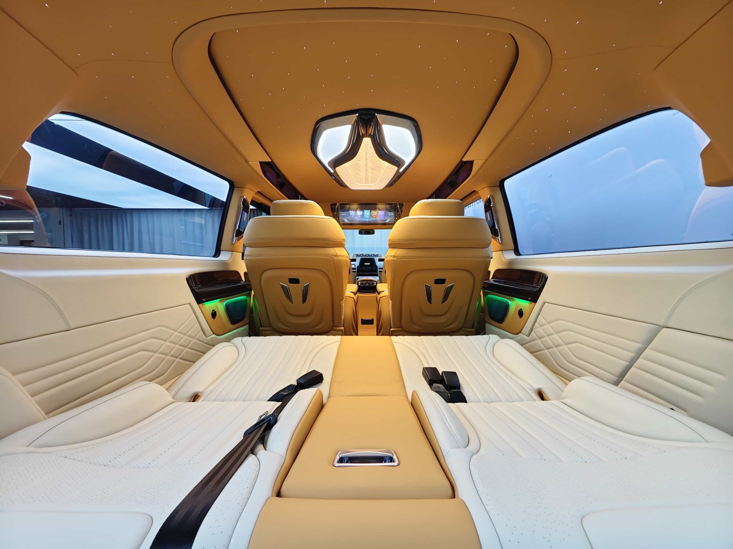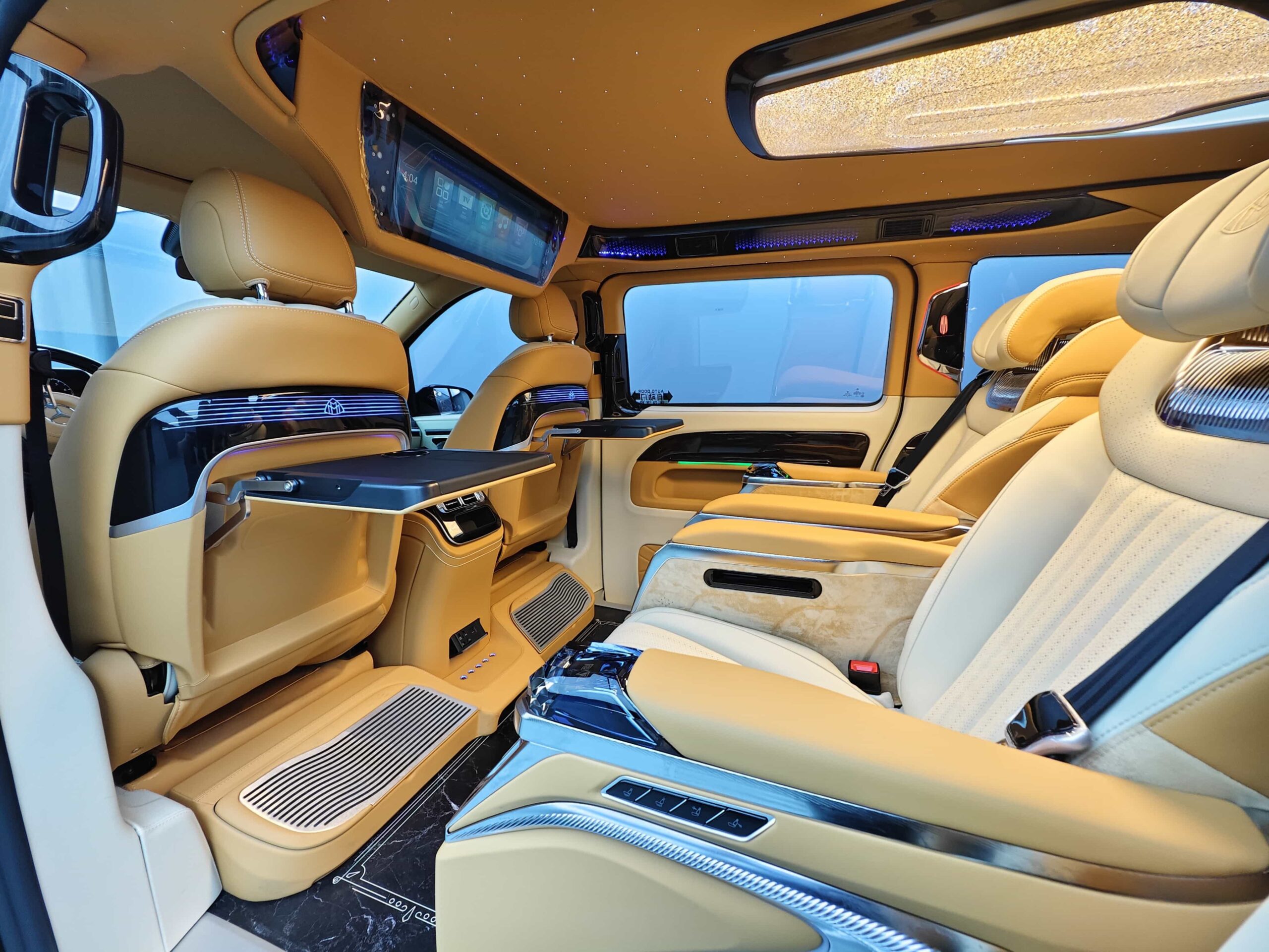 【Luxury Features】⭐ Imperial Court No. 1 Center Console ⭐ 5.0-inch Crystal Throne Seats in the Middle Row, featuring voice control, 360° rotation, 180° seat adjustment, ventilation, heating, and massage ⭐ Three-person Sofa Seats with front drawers and a touchscreen display ⭐ Phantom-style Luxury Roof Lights, Rolls-Royce-style starlight roof, and embedded ambient lighting ⭐ “High Mountains and Flowing Water” Body Kit ⭐Trendy Alloy Wheels⭐Dual Electric Side Doors⭐Power Tailgate⭐Triple-Lens Laser Headlights⭐Smoked Taillights⭐ Chrome trim throughout the vehicle⭐ Full Nappa leather upholstery⭐ High-grade soundproofing, noise insulation, and vibration damping throughout the vehicle⭐ Power-cooled and heated refrigerator, landscape-oriented smart TV, fold-out business table, storage footrest, seamless aluminum flooring, privacy curtains, and over 40 other upgrades
